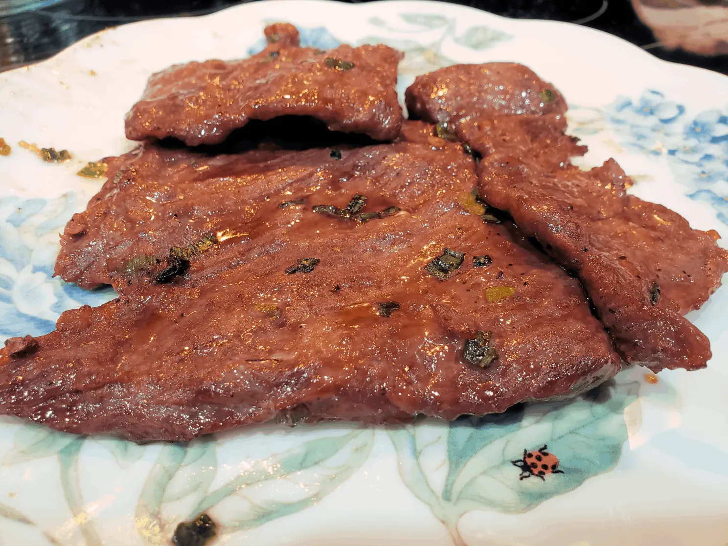 Jumulleok is a simply prepared short cut steak (any thin cut meat may be used) that is massaged with sesame oil and garlic, then lightly seasoned with salt and pepper before either grilling or frying. The meat can be beef, pork 돼지주물럭 (dwaeji jumulleok), or duck 오리 주물럭 (Ori-jumulleok)