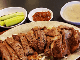 Serve Ssam style with sliced garlic, lettuce, Ssamjang, and dipping sauce.