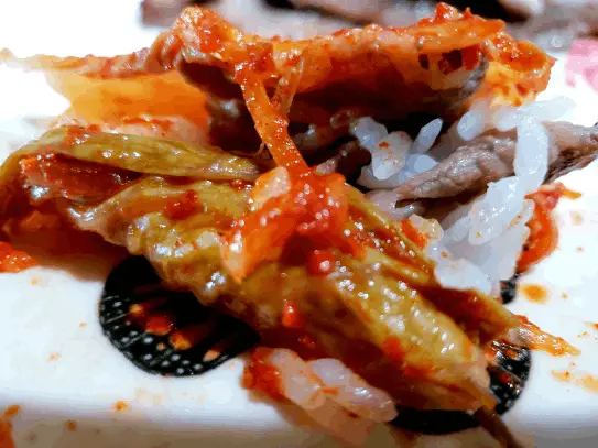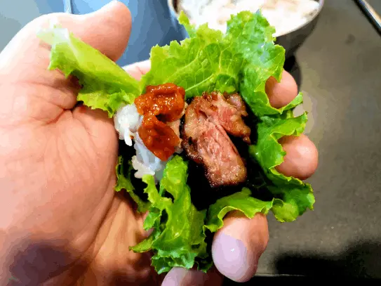 Ssam is a popular Korean meal where ingredients, often meat, are wrapped in edible coverings such as leafy vegetables. This type of dining is great as "Family Style" and typically involves cooking meats and vegetables on a tabletop grill while having wraps, banchan, and condiments easily accessible around the table. The most common ssam dish consists of pork wrapped in lettuce or cabbage, served with a spicy sauce called ssamjang, and accompanied by toppings like garlic, onion, green pepper or other banchan like kimchi.